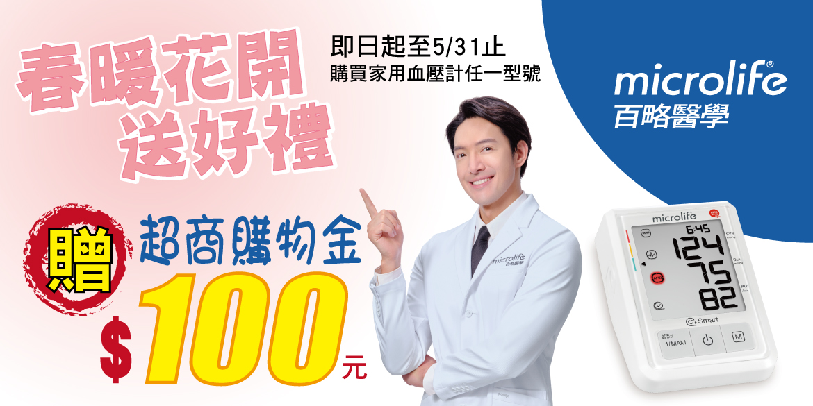 於活動期間購買家用血壓計系列任一機種,成為百略會員,並完成保固登錄資訊及發票上傳,即可兌換「$100四大超商電子購物金」。
